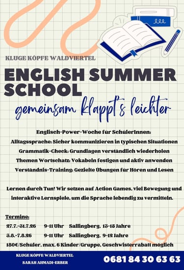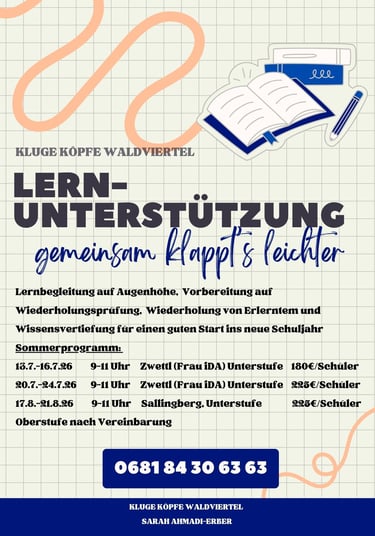 Ich biete gezielte Nachhilfe in kleinen Gruppen (max. 4 SchülerInnen) an. Eine Einheit dauert 110 Minuten inklusive einer kleinen Pause zum Durchatmen. Was genau gelernt wird, besprechen wir vorab gemeinsam, damit wir direkt loslegen können!
